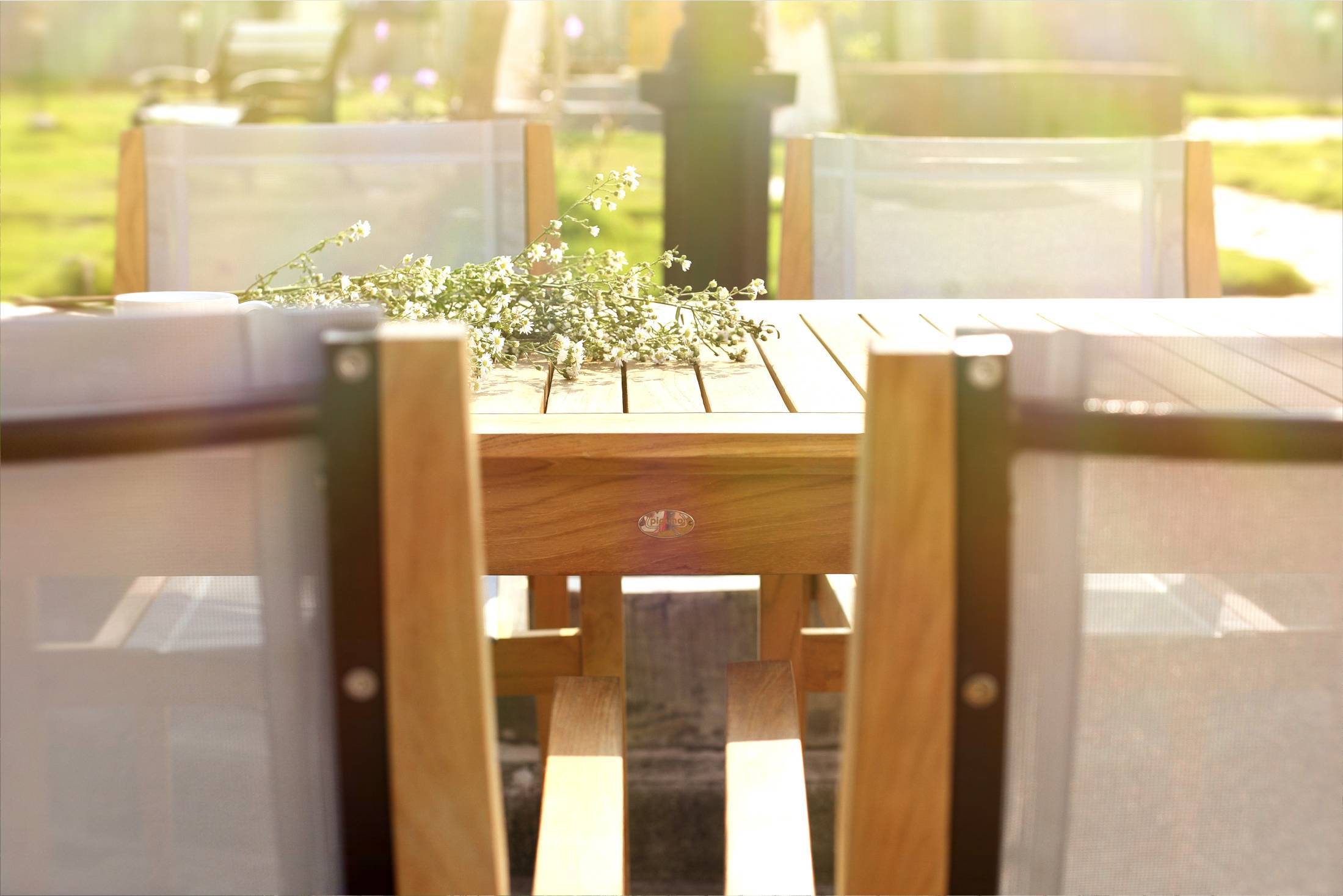 ✔ Premium outdoor materials – teak wood, aluminum, and Batyline fabric for durability and comfort.