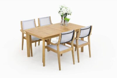 Elevate your outdoor dining space with the Aleena Outdoor Dining Set, where contemporary design meets premium craftsmanship. Thoughtfully designed for luxurious outdoor living, this set blends high-quality teak wood, durable aluminum, and sleek Batyline fabric, offering a refined aesthetic with outstanding durability. Whether for a private patio, garden, or commercial outdoor dining, this set brings an effortless touch of modern sophistication.