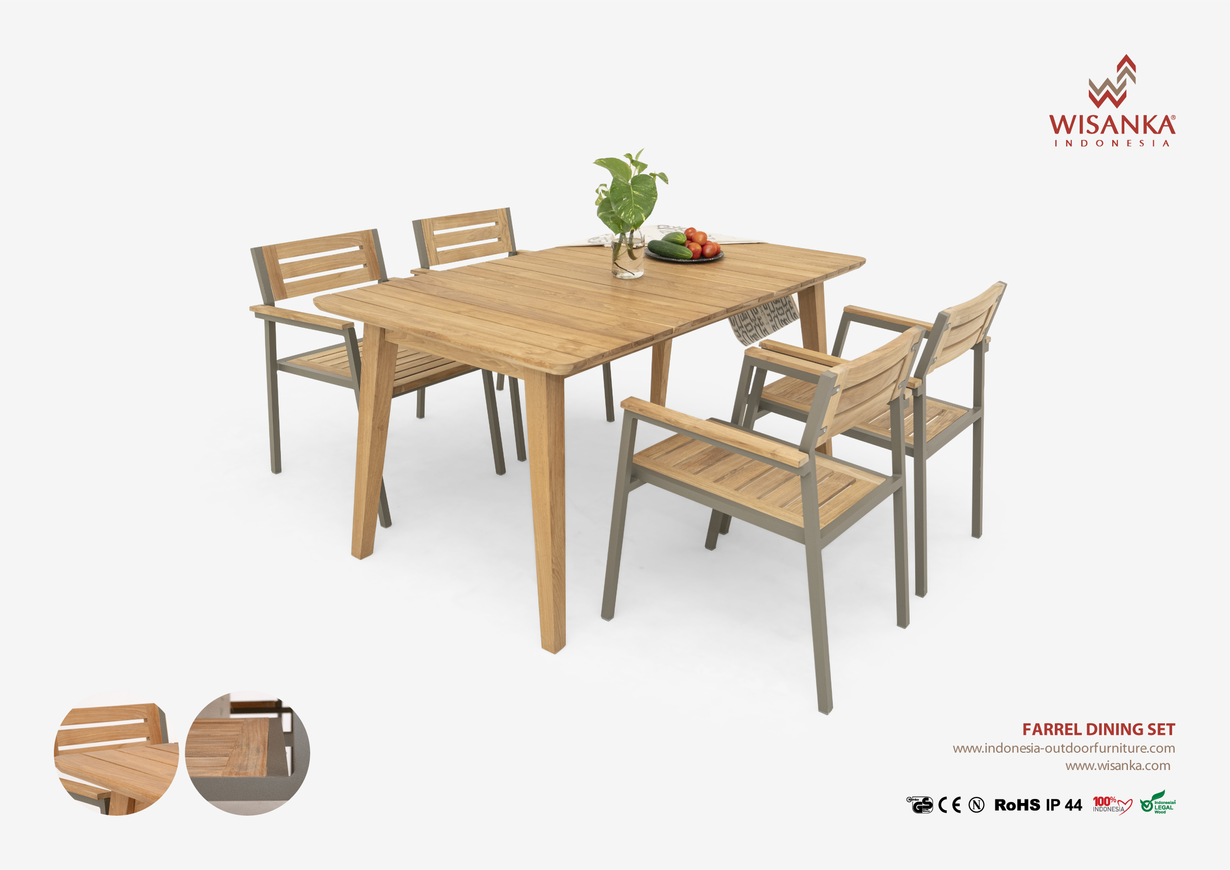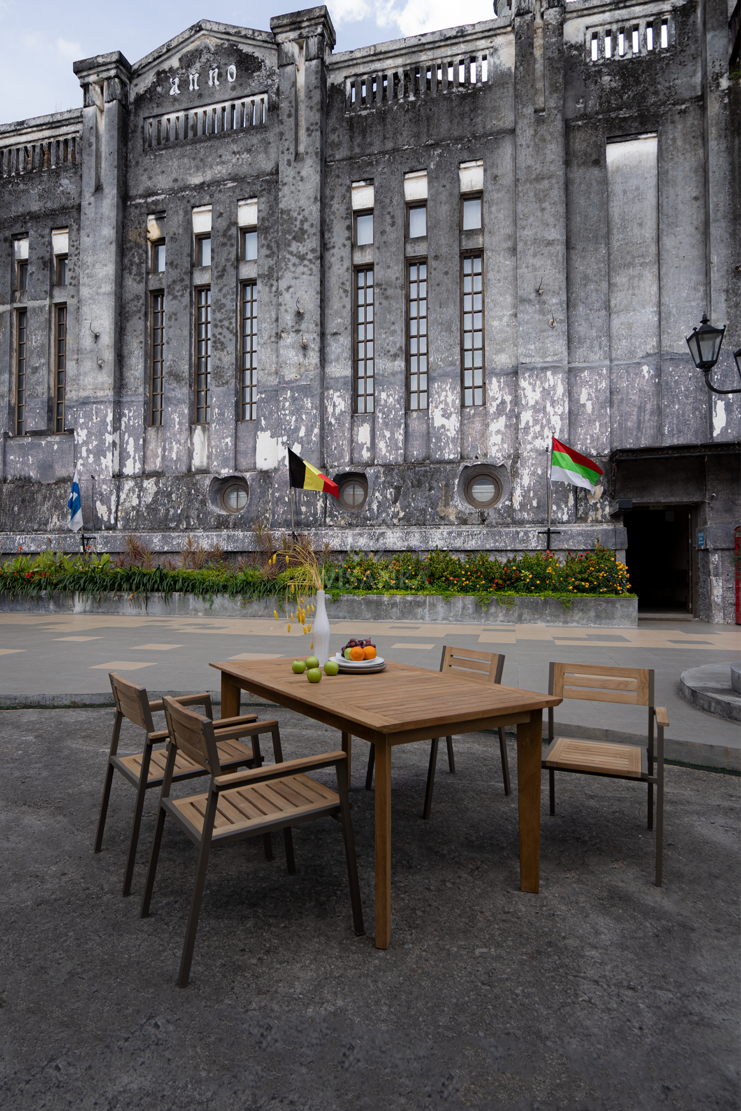 the Dining Table – A robust teak wood top supported by a powder-coated aluminum frame, combining strength with sophistication.