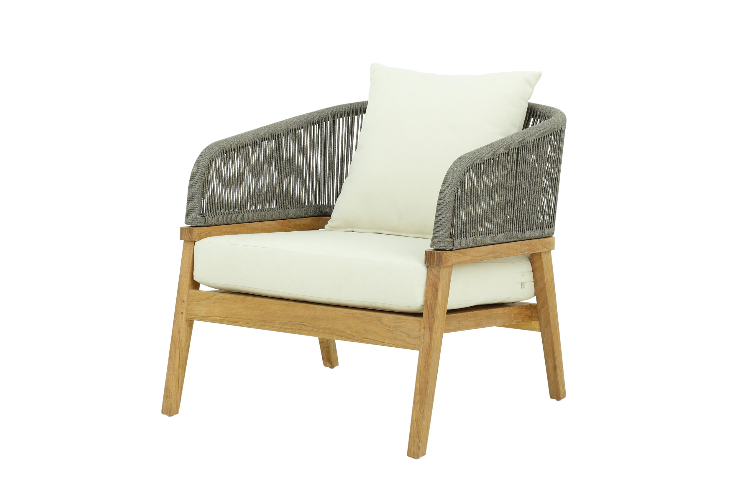 Each piece is crafted from solid teak wood, known for its natural weather resistance, strength, and timeless beauty. The natural fine sanded finish highlights the teak’s rich character, while the grey outdoor rope and powder-coated aluminum frame provide a striking, textural contrast.