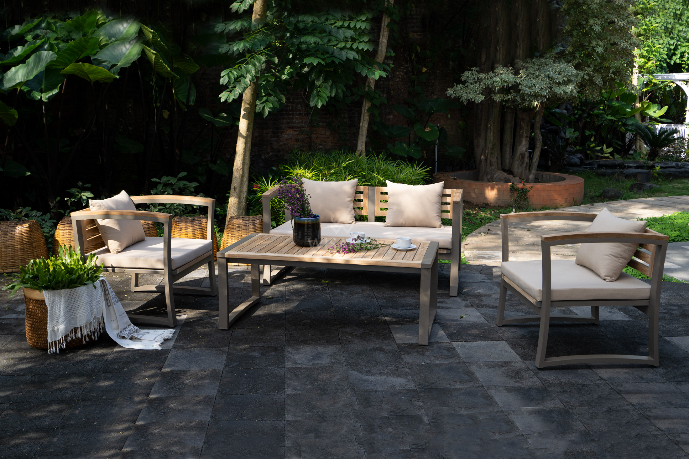 ilson Outdoor Living Set – Clean, modern teak and aluminum seating that brings indoor-level comfort to outdoor spaces.